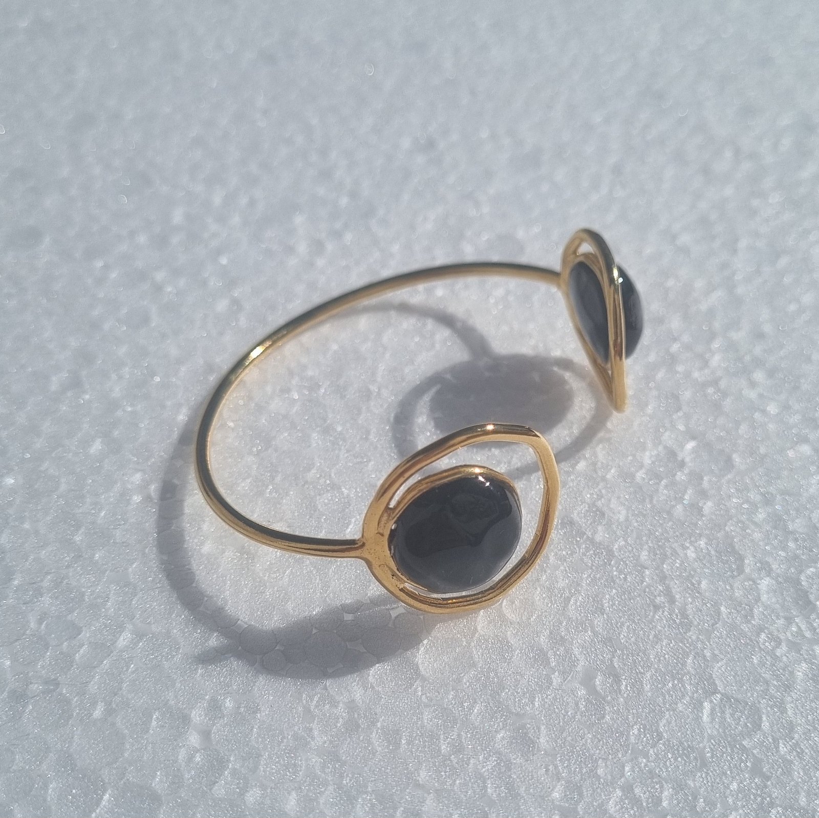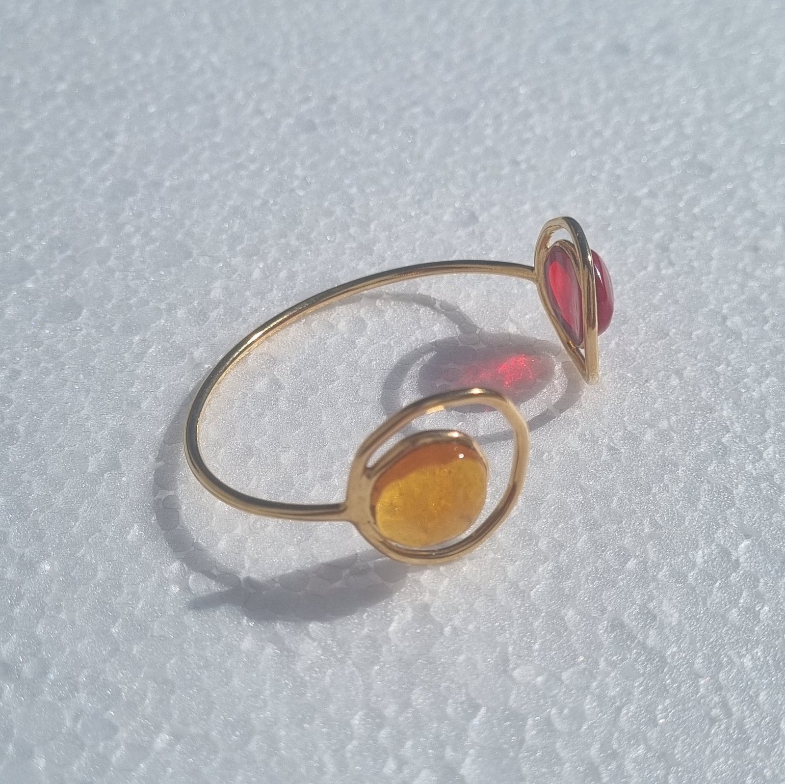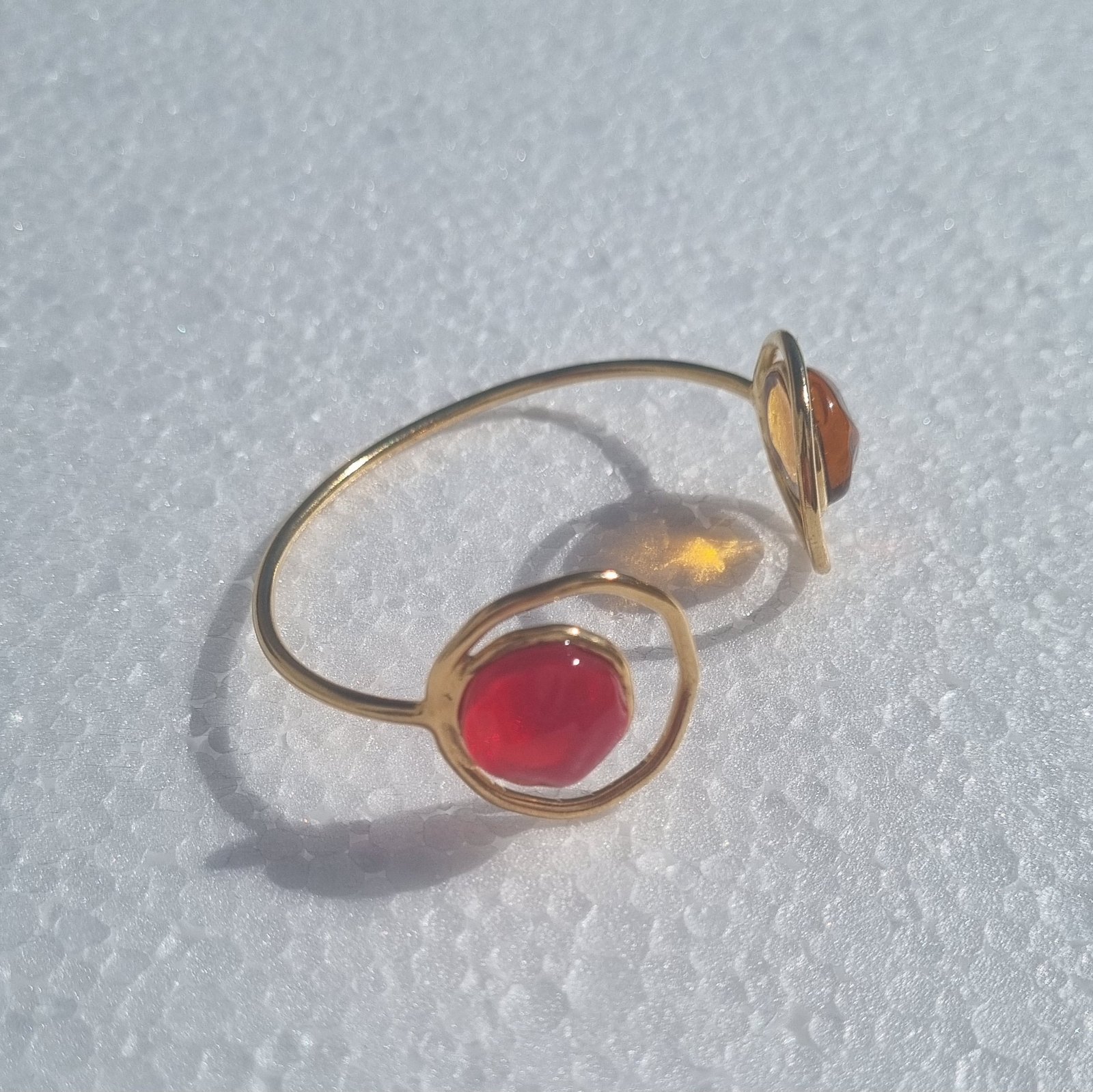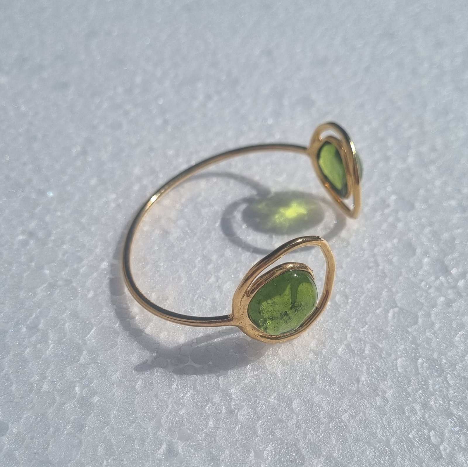 Les bracelets Arvarus sont réalisés en laiton recouvert d’une fine couche d’or et sublimés par du verre coulé à la main, révélant un éclat vibrant et une texture singulière propre à chaque création. Inspirés par les formes aléatoires, d’où leur nom en breton, ces bijoux célèbrent la beauté de l’imprévisible. Un bijou au design singulier qui se porte aussi bien au quotidien que lors d’occasions spéciales.